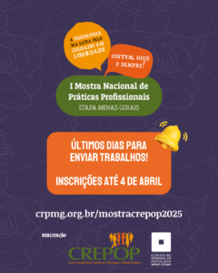O prazo para participar da I Mostra Nacional de Práticas Profissionais “A Psicologia na luta pelo cuidado em liberdade: ontem, hoje, sempre!” – Etapa Minas Gerais está chegando ao fim. As inscrições para o evento terminam nesta sexta-feira, 4 de abril. Essa é a última oportunidade para psicólogas(os) e usuárias(os) da Rede de Atenção Psicossocial (RAPS) inscreverem seus trabalhos e concorrerem à premiação.
